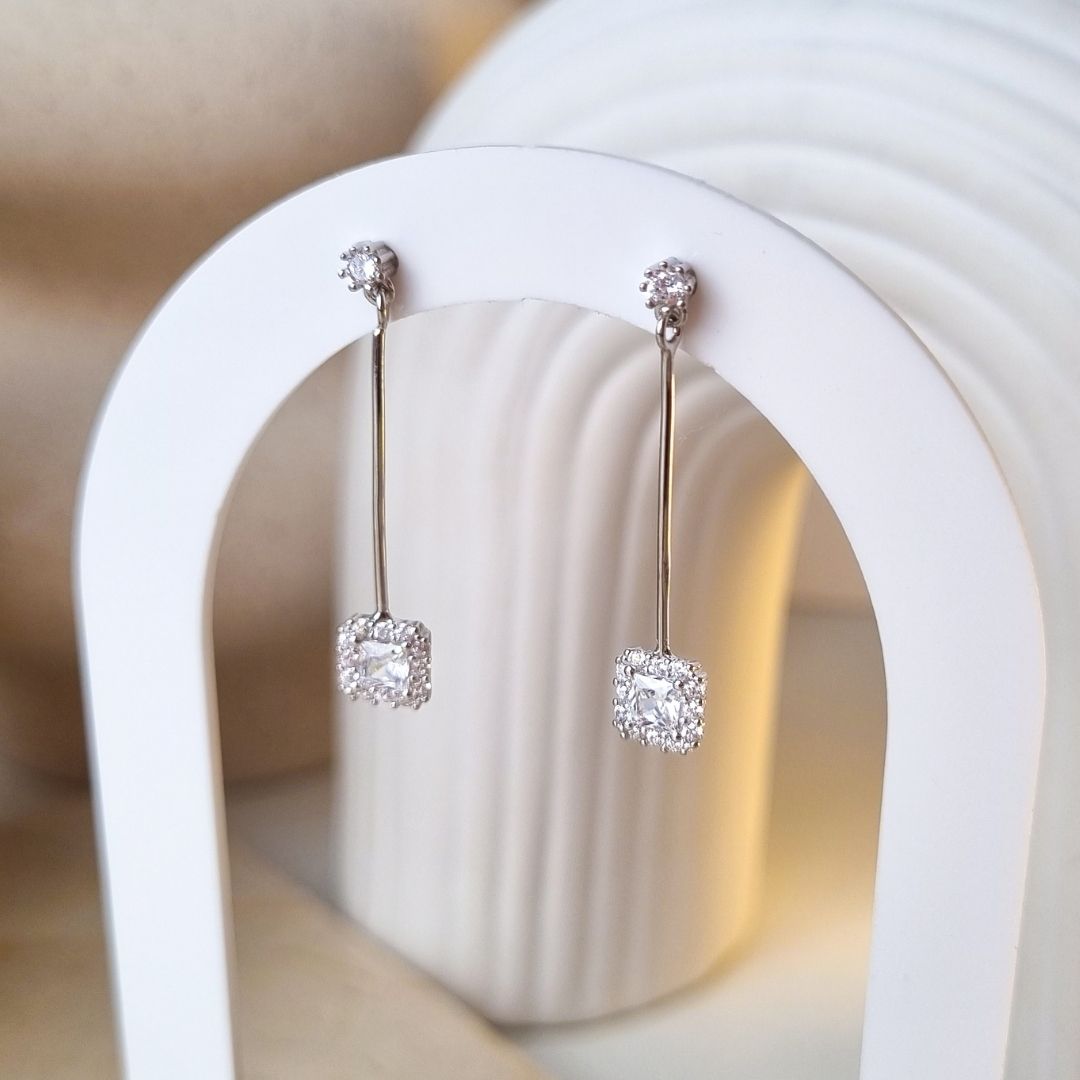 De Amaia oorbellen hebben een moderne, vierkante hanger met steentjes en zijn lang vanwege het verticale tussenstuk. Dankzij het verfijnde ontwerp zijn deze zilveren hang oorbellen perfect bij luxe outfits zoals een trouwjurk of een gala outfit.